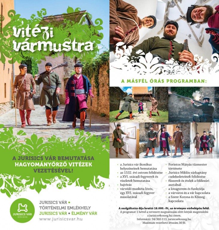 VITÉZI VÁRMUSTRAA Jurisics vár bemutatása hagyományőrző vitézek vezetésével! Kőszeg 1532-ben állította meg a Bécs ellen vonuló török sereget Jurisics Miklós várkapitány parancsnoksága alatt. A másfél órás programban: